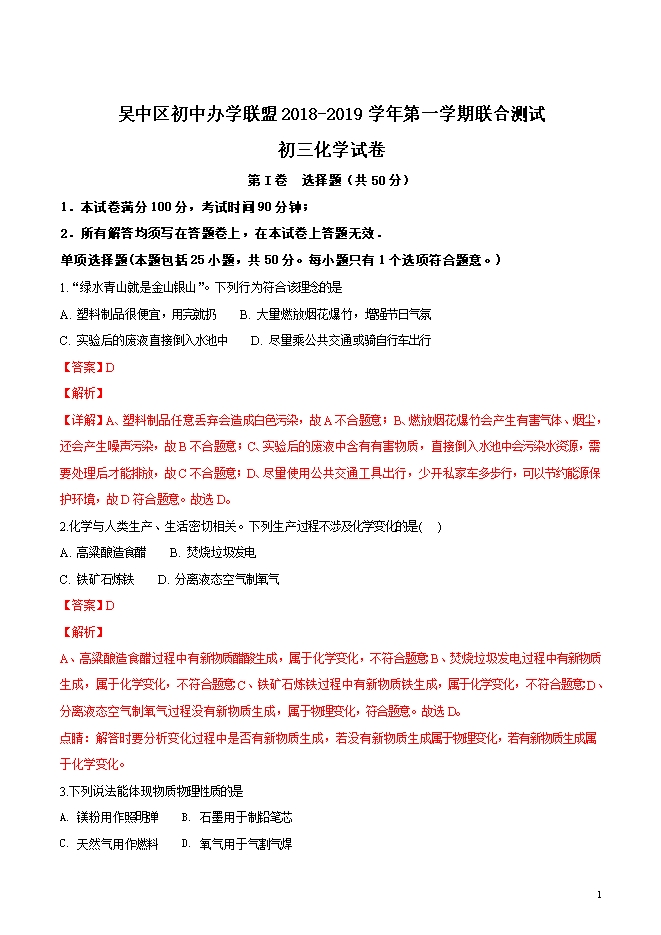 精品解析:江苏省苏州市吴中区2019届九年级上学期10月教学质量检测化学试题(word版含答案解析)