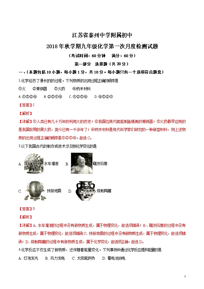 精品解析:江苏省泰州中学附属初级中学2019届九年级上学期10月月考化学试题(word版含答案解析)