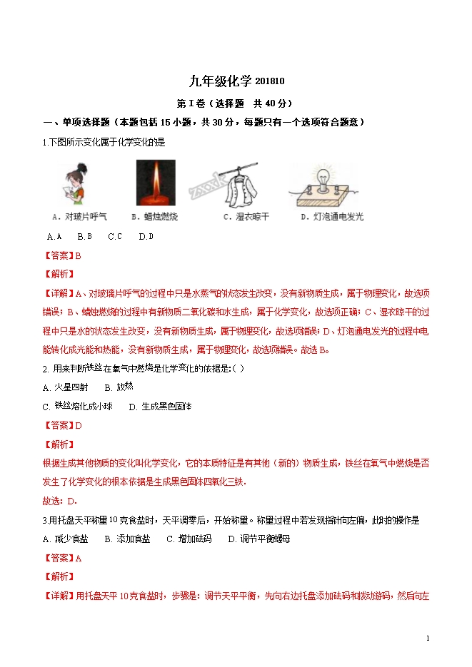 精品解析:江苏省扬州市江都区大桥镇中学、郭村中学、郭村第一中学和花荡中学四校2019届九年级上学期10月联考化学试题(word版含答案解析)