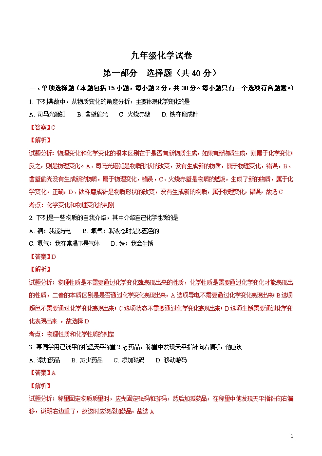所属专辑: 《2019届九年级上学期10月份月考化学试题汇总》专辑