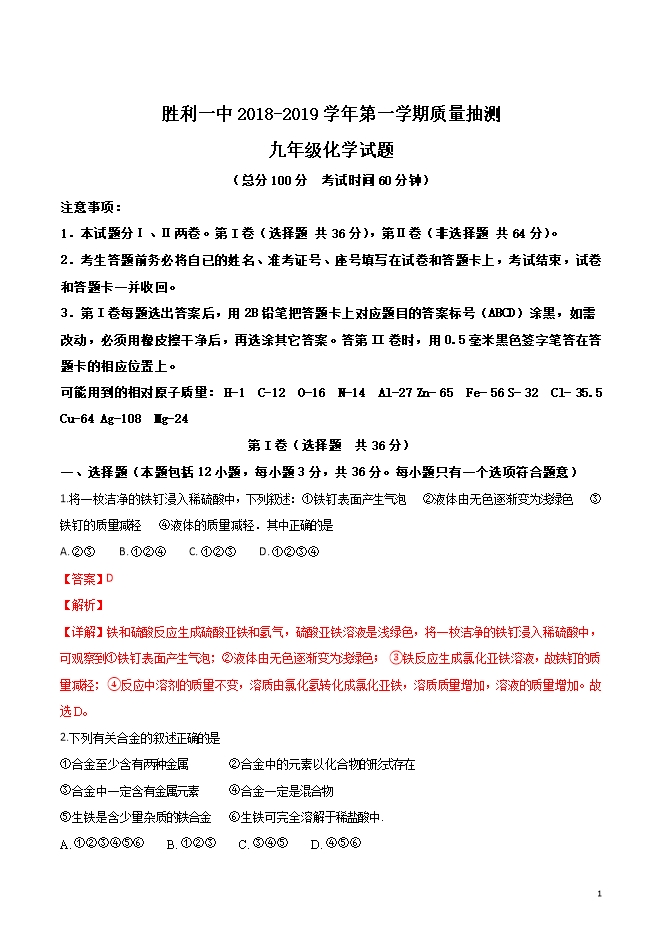 精品解析:山东省东营市第一胜利中学2019届九年级上学期第二次月考化学试题(word版含答案解析)