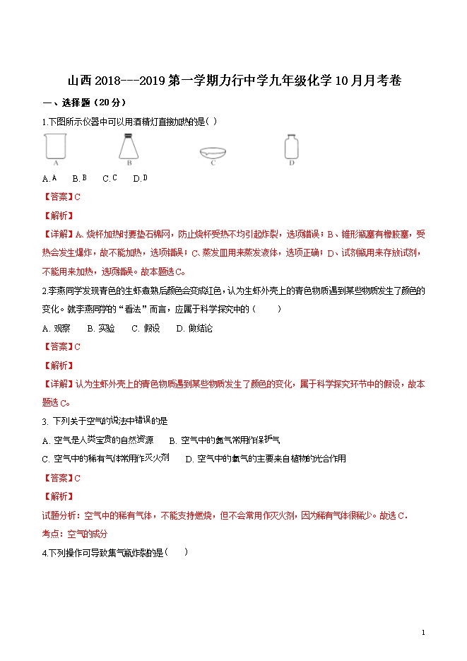 【内容简介】精品解析:山西省运城市力行中学2019届九年级第一学期10月月考化学试题(word版含答案解析)