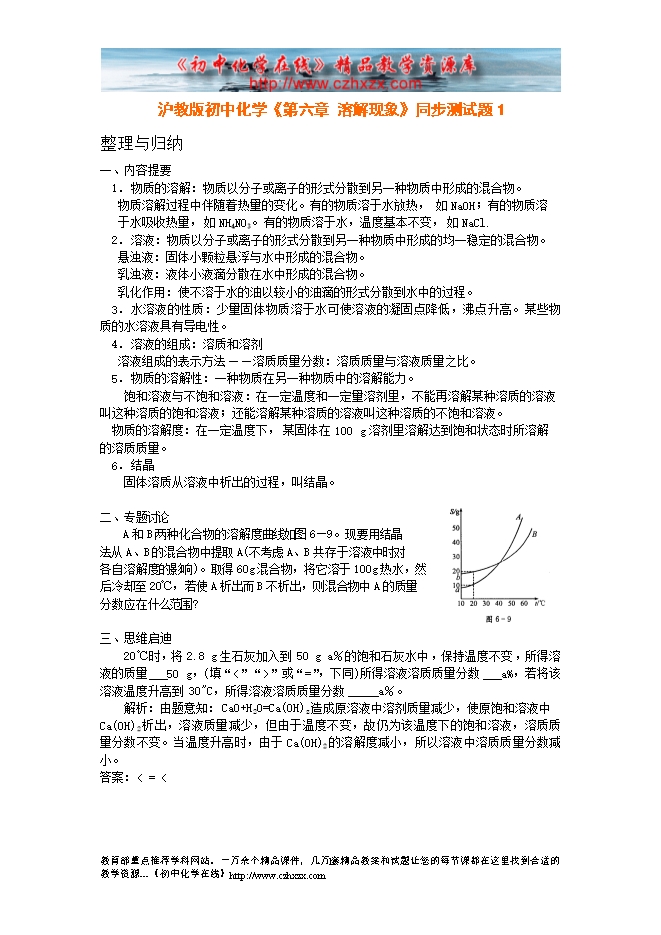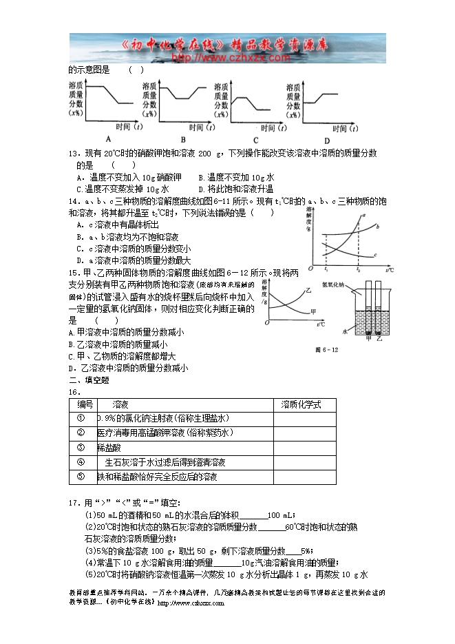 沪教版初中化学《第六章 溶解现象》同步测试题1