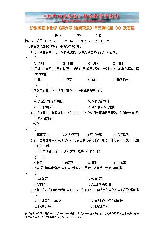 沪教版初中化学《第六章 溶解现象》单元测试题(A)及答案