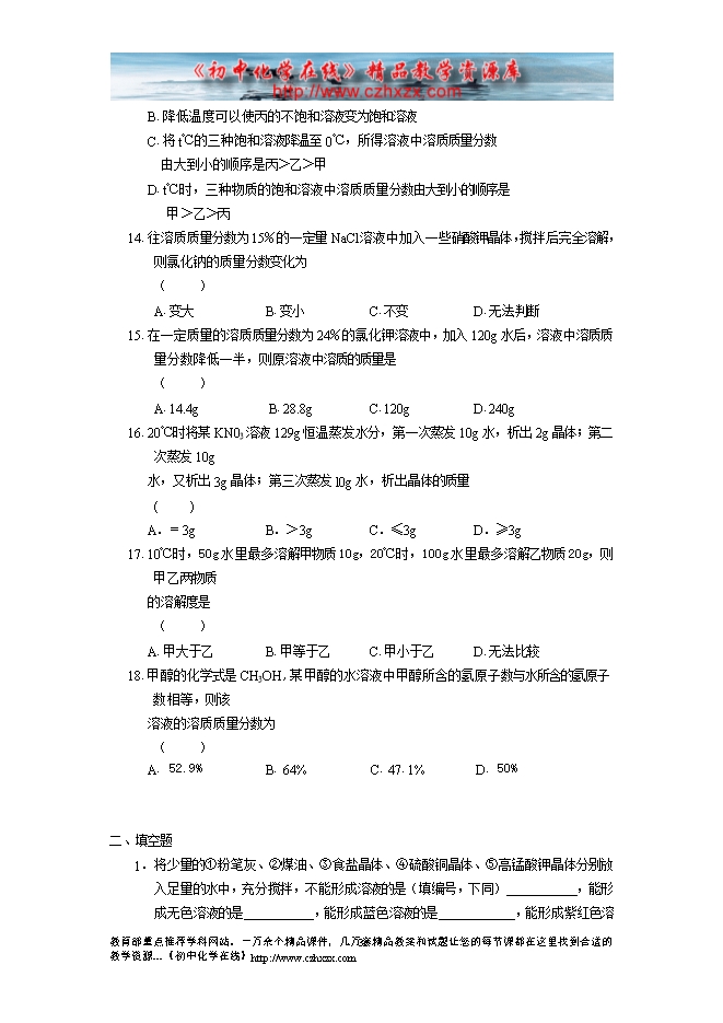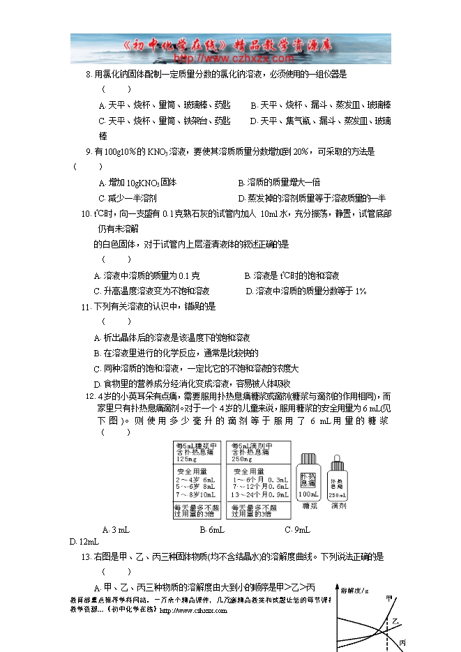 - 下一份试卷:沪教版初中化学《第六章 溶解现象》单元测试题(B)及答案