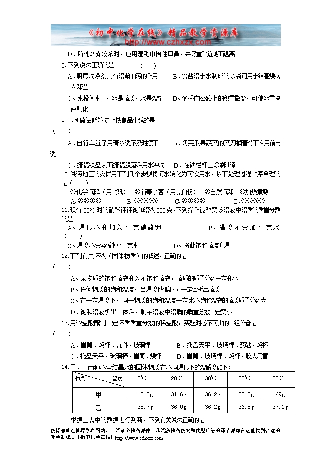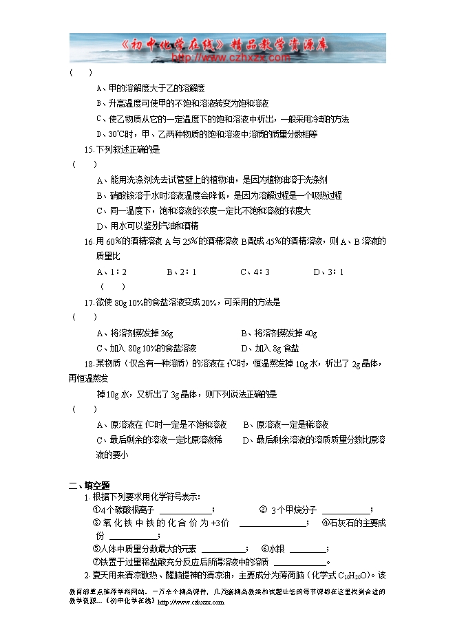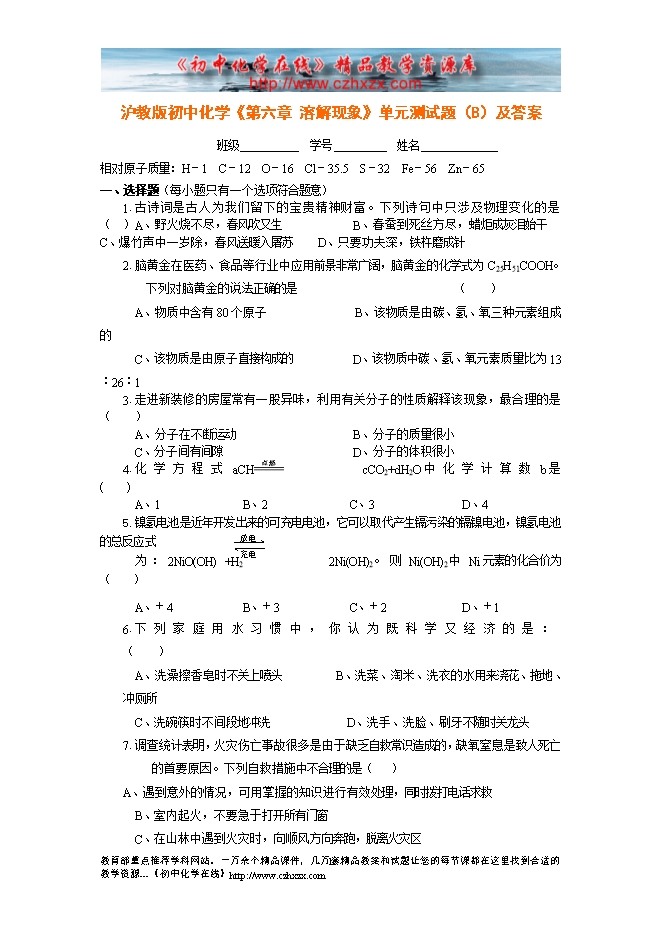 沪教版初中化学《第六章 溶解现象》单元测试题(B)及答案