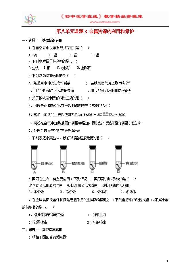 【内容简介】人教版九年级化学下册《第八单元金属和金属材料课题3 金属资源的利用和保护(第1课时)》一课一练(word版含答案解析)