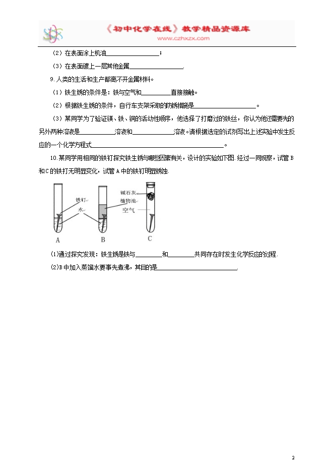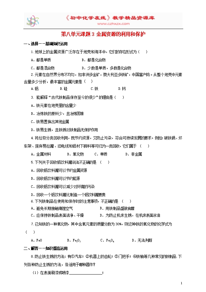 【内容简介】人教版九年级化学下册《第八单元金属和金属材料课题3 金属资源的利用和保护(第2课时)》一课一练(word版含答案解析)