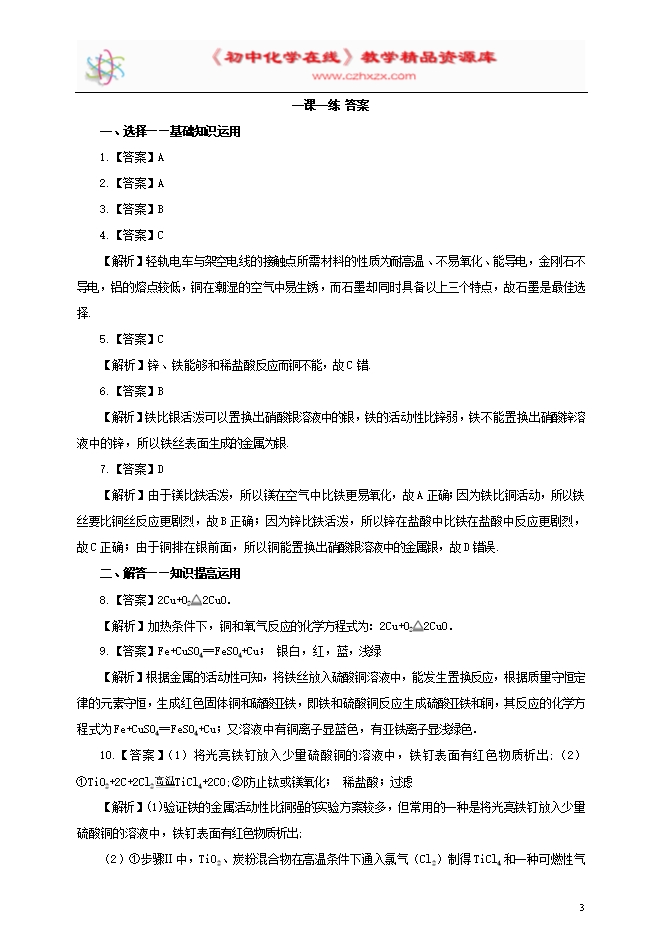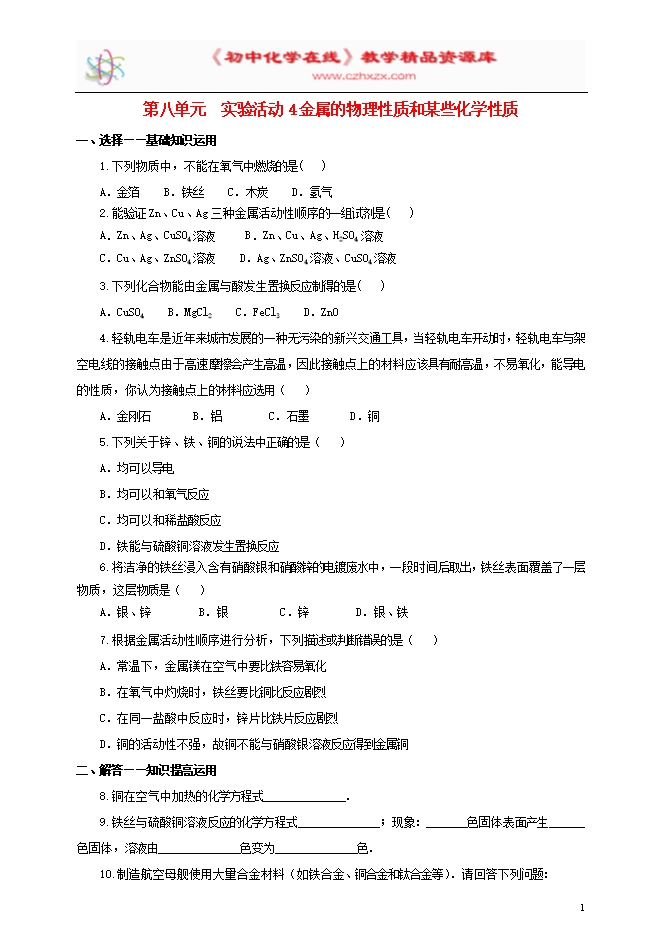 【内容简介】人教版九年级化学下册《第八单元金属和金属材料实验活动4 金属的物性质和某些化学性质》一课一练(word版含答案解析)