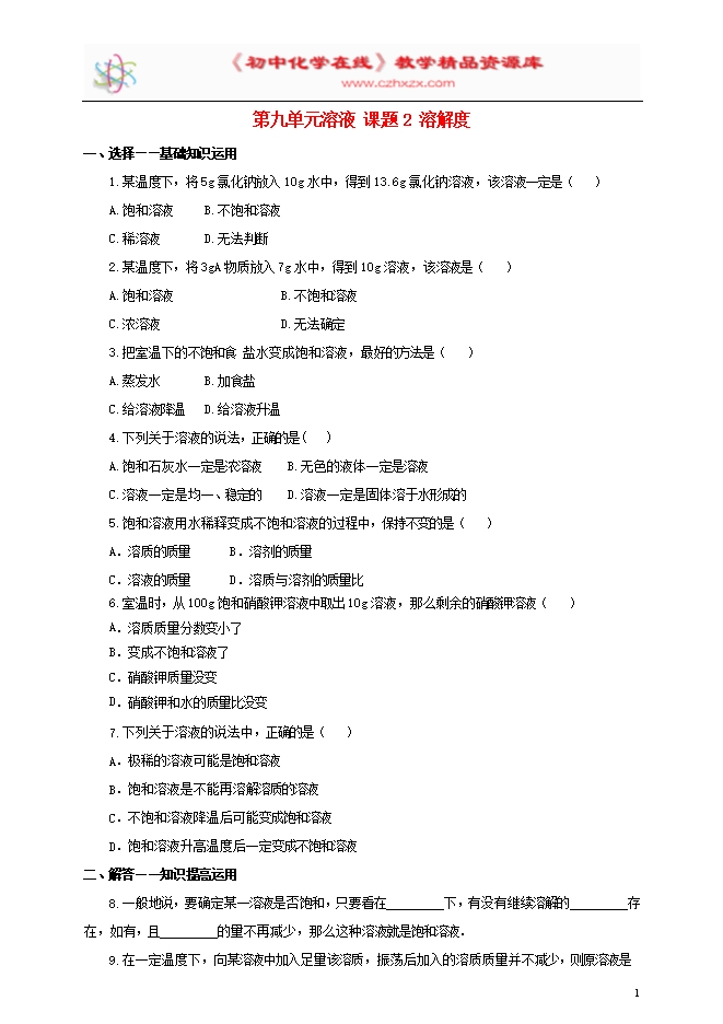 【内容简介】人教版九年级化学下册《第九单元溶液课题2 溶解度(第1课时)》一课一练(word版含答案解析)