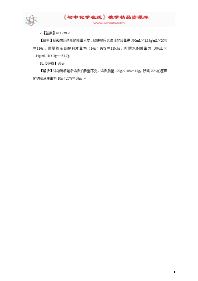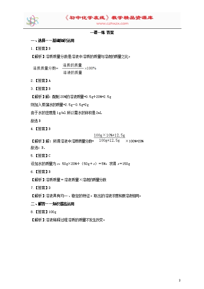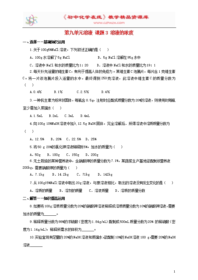 【内容简介】人教版九年级化学下册《第九单元溶液课题3 溶液的浓度》一课一练(word版含答案解析)
