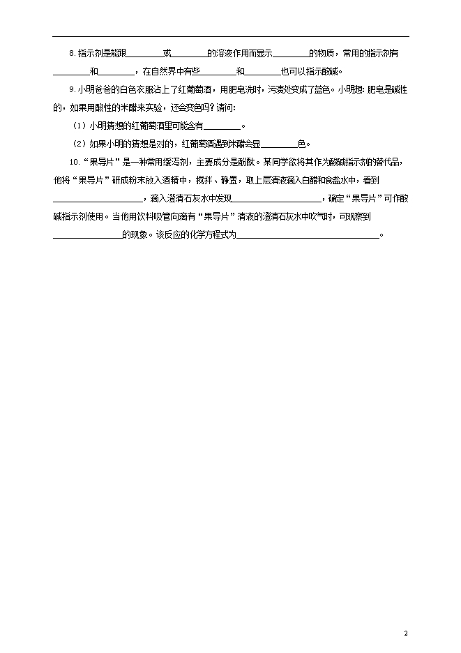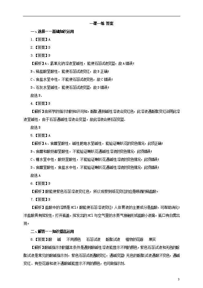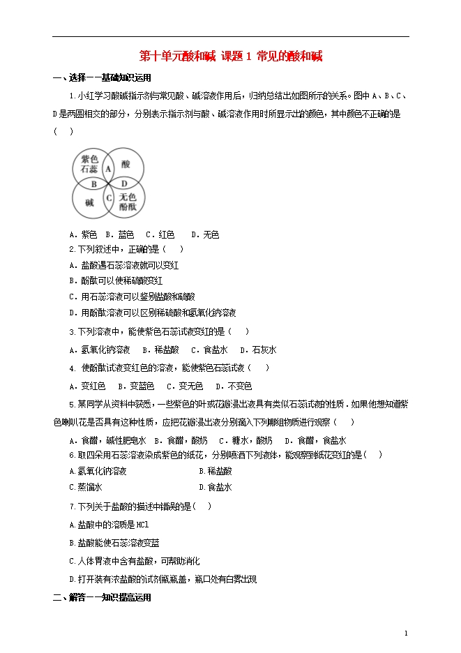 【内容简介】人教版九年级化学下册《第十单元酸和碱课题1 常见的酸和碱(第1课时)》一课一练(word版含答案解析)