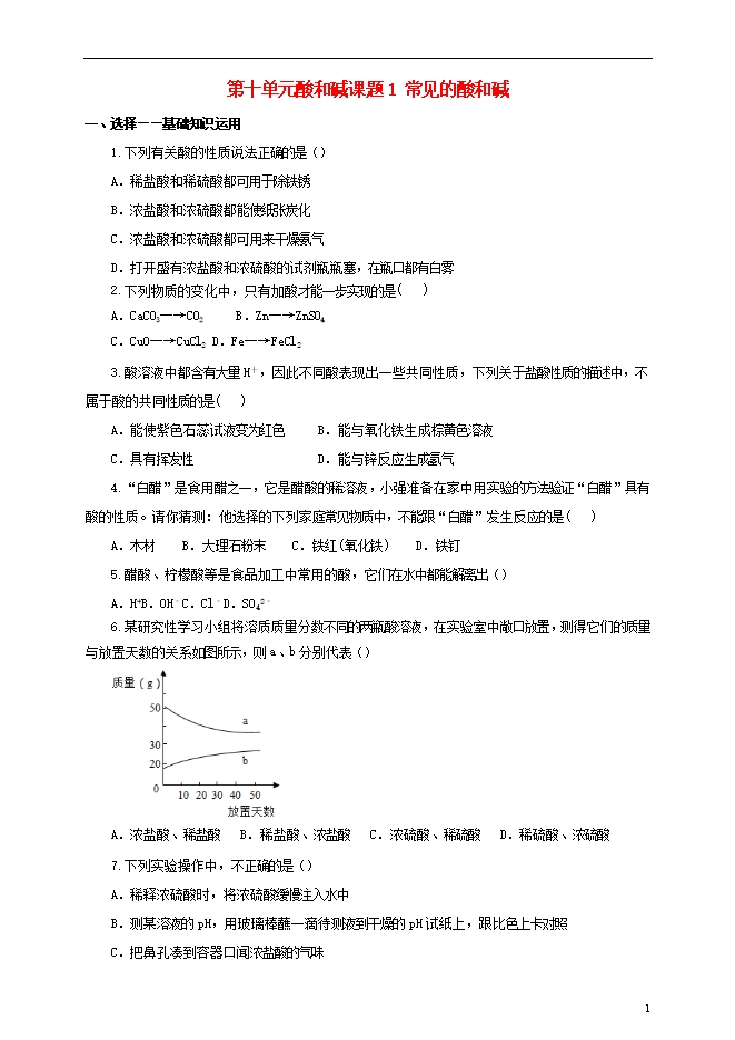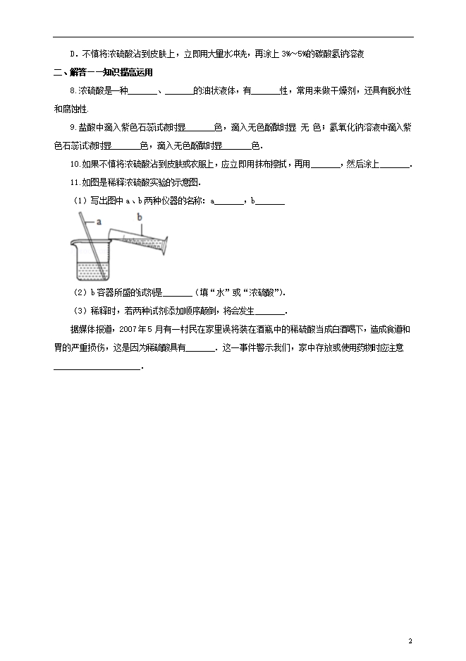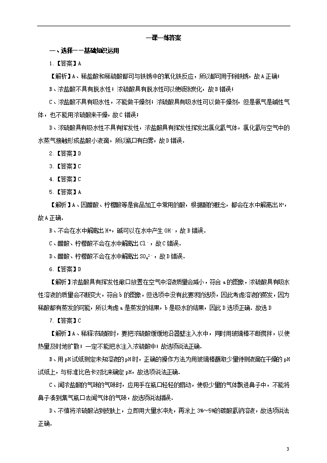 【内容简介】人教版九年级化学下册《第十单元酸和碱课题1 常见的酸和碱(第2课时)》一课一练(word版含答案解析)