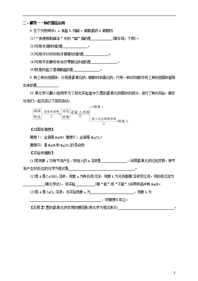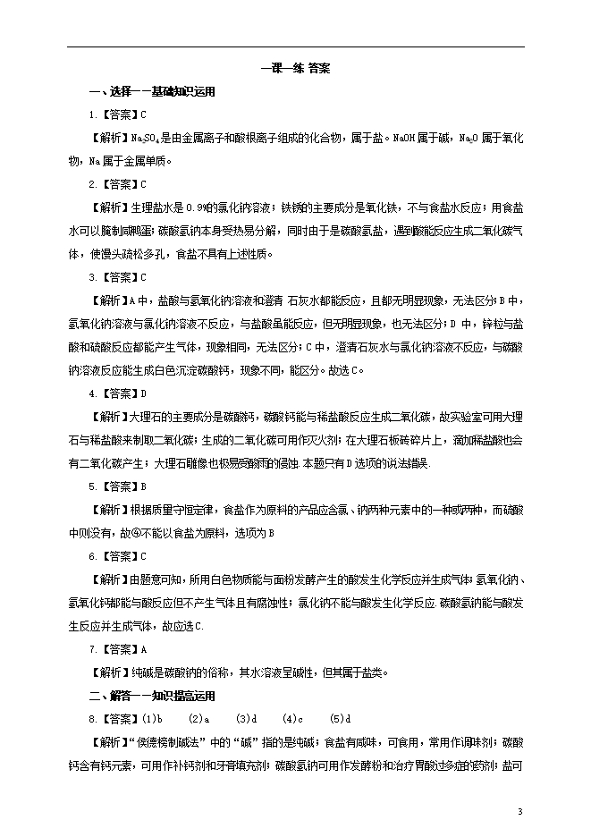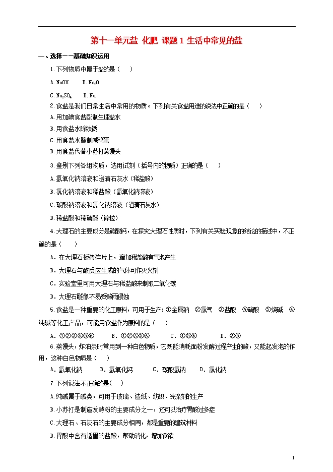 【内容简介】人教版九年级化学下册《第十一单元盐化肥课题1 生活中常见的盐(第1课时)》一课一练(word版含答案解析)