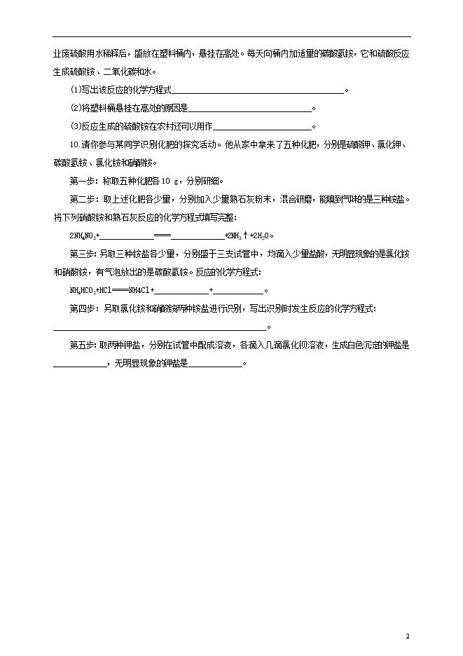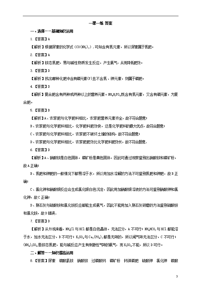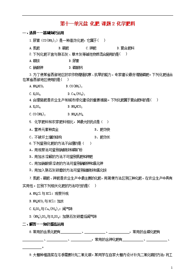 【内容简介】人教版九年级化学下册《第十一单元盐化肥课题2 化学肥料》一课一练(word版含答案解析)