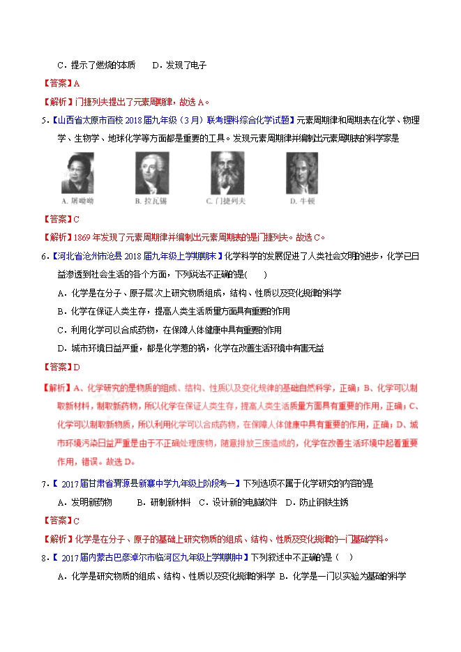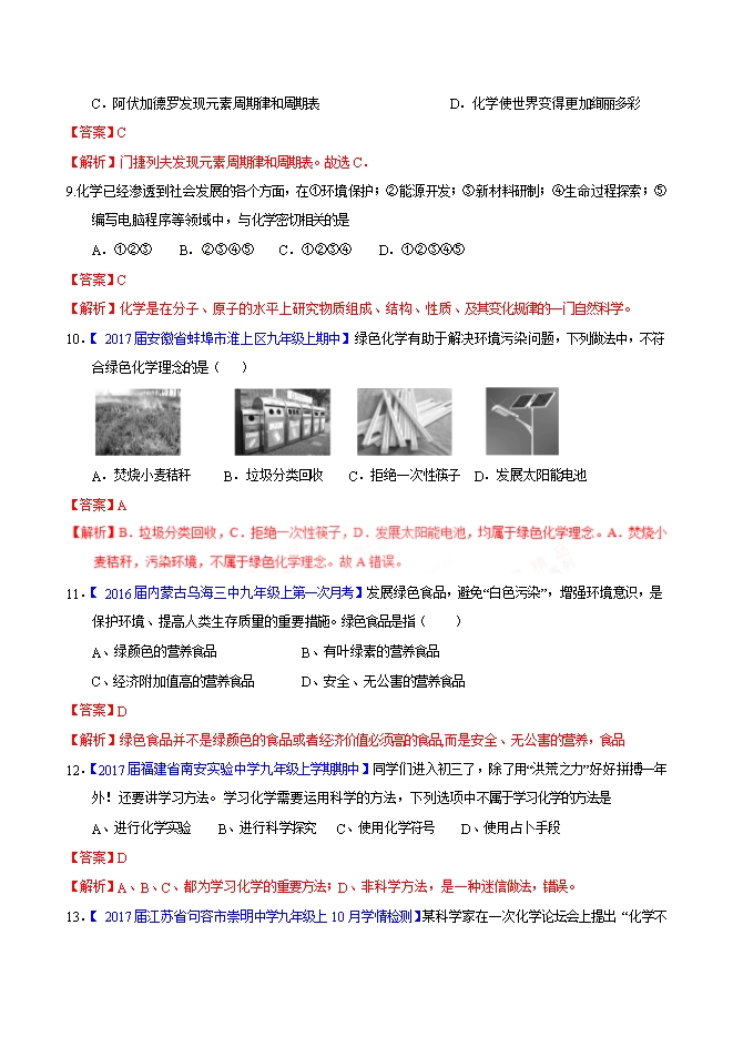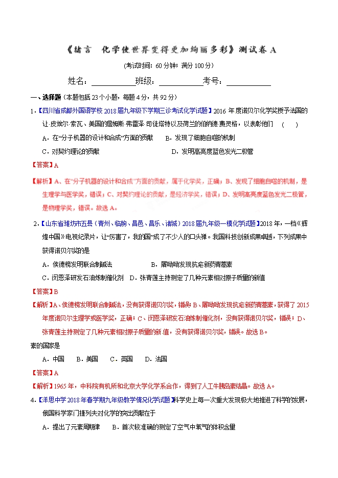 【内容简介】2019届人教版九年级化学《绪言 化学使世界变得更加绚丽多彩》同步单元双基双测“AB”卷(A卷)(word版含答案解析)