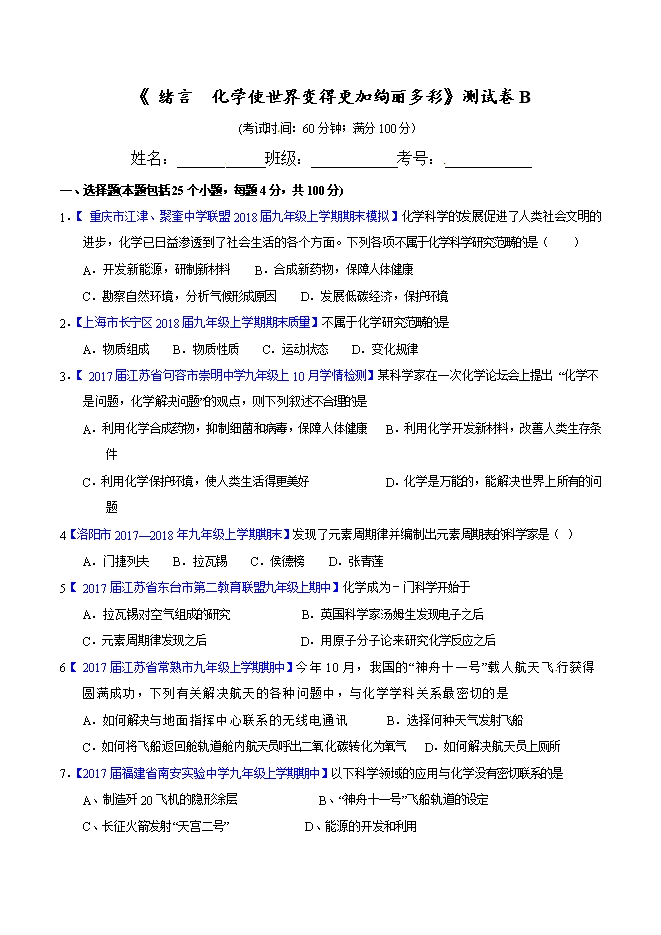 【内容简介】2019届人教版九年级化学《绪言 化学使世界变得更加绚丽多彩》同步单元双基双测“AB”卷(B卷)(word版无答案)