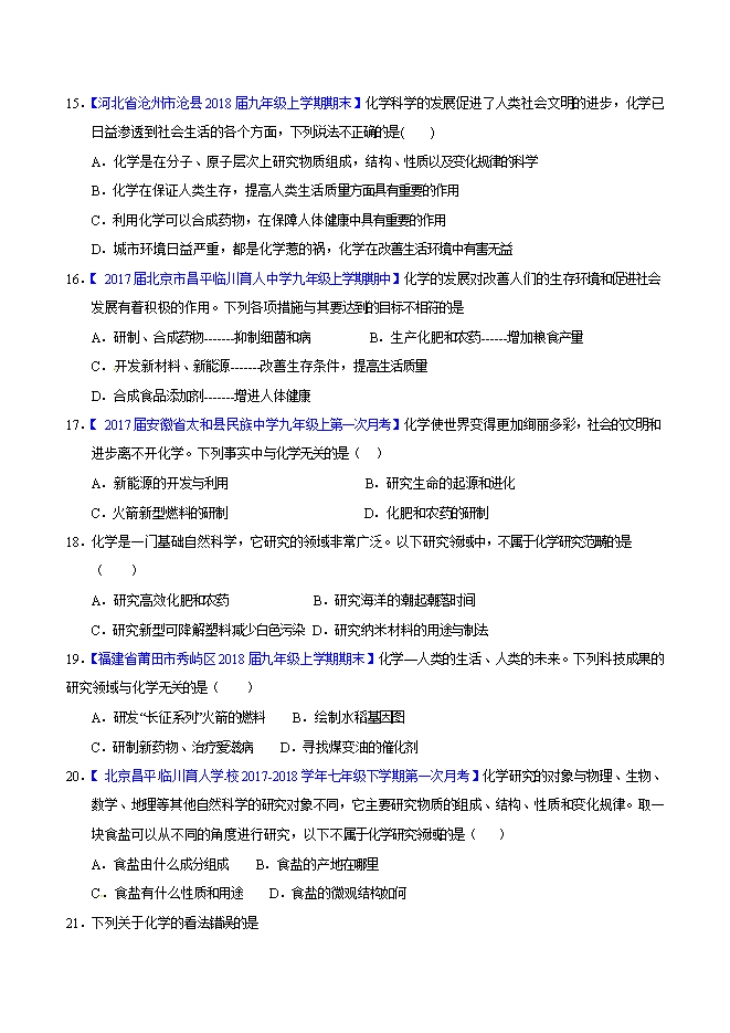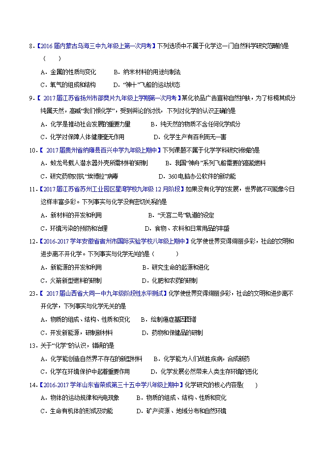 2019届人教版九年级化学《绪言 化学使世界变得更加绚丽多彩》同步单元双基双测“AB”卷(B卷)(word版无答案)