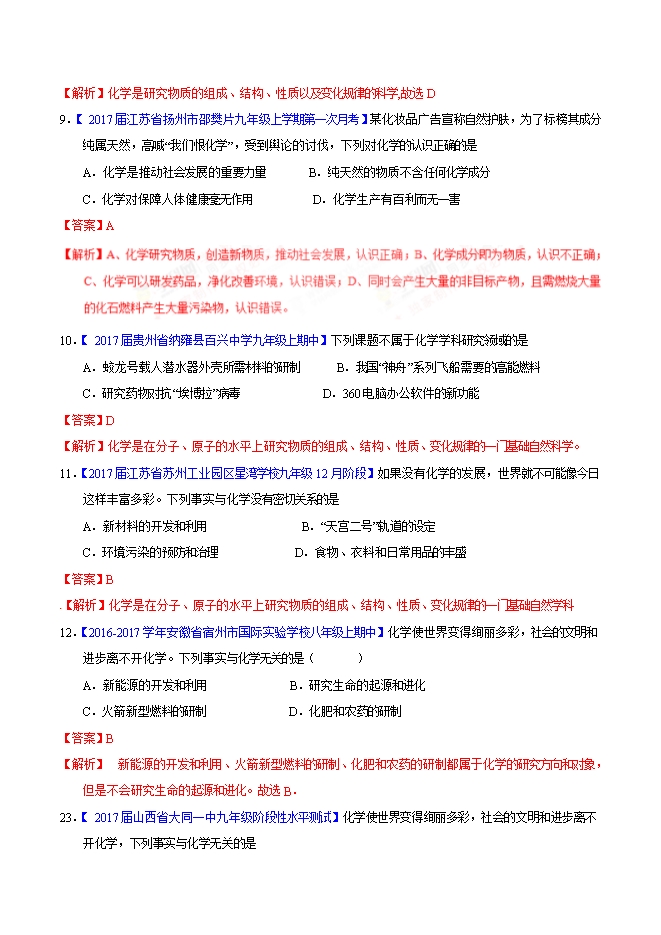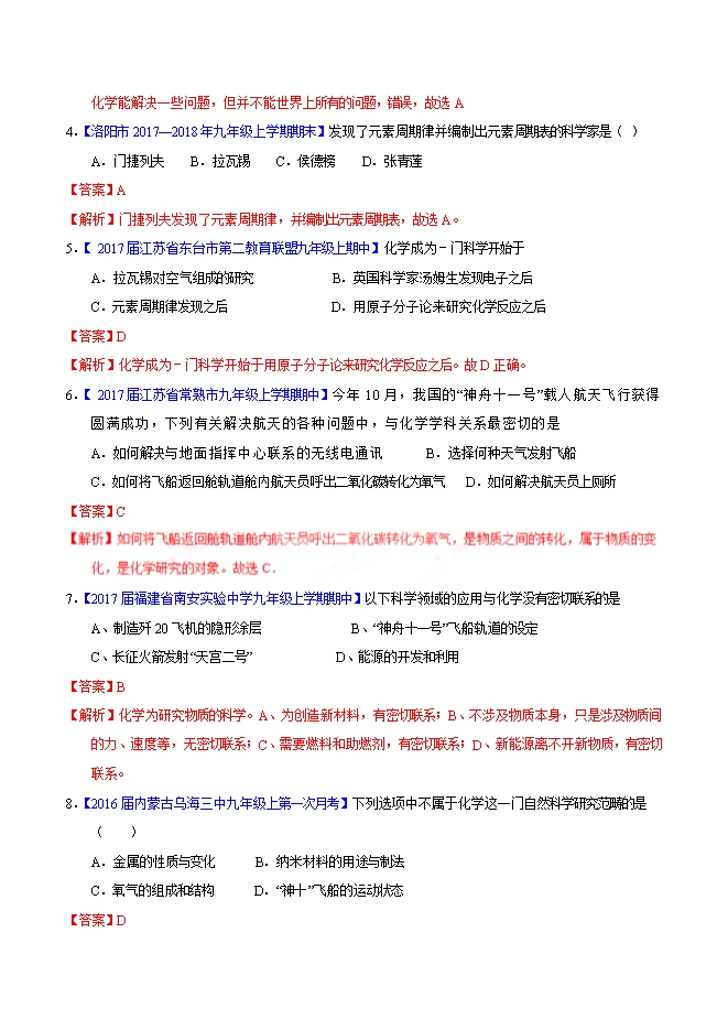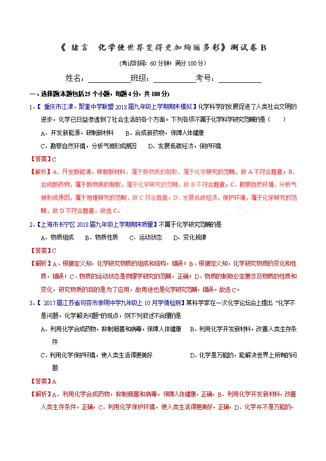 【内容简介】2019届人教版九年级化学《绪言 化学使世界变得更加绚丽多彩》同步单元双基双测“AB”卷(B卷)(word版含答案解析)