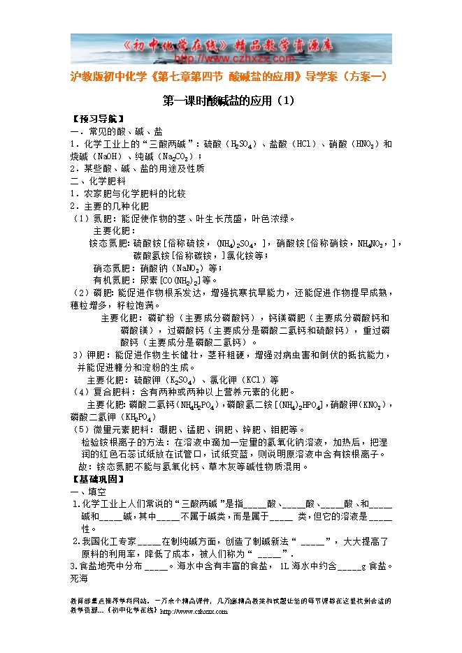 沪教版初中化学《第七章酸碱盐的应用》导学案(旧方案一)