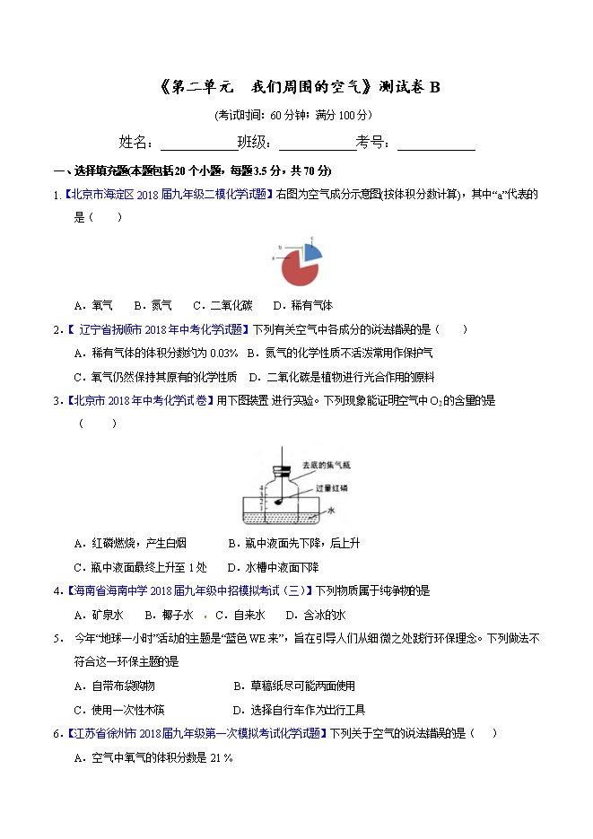 【内容简介】2019届人教版九年级化学《第二单元 我们周围的空气》同步单元双基双测“AB”卷(B卷)(word版无答案)