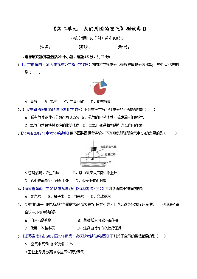 【内容简介】2019届人教版九年级化学《第三单元 物质构成的奥秘》同步单元双基双测“AB”卷(B卷)(word版无答案)