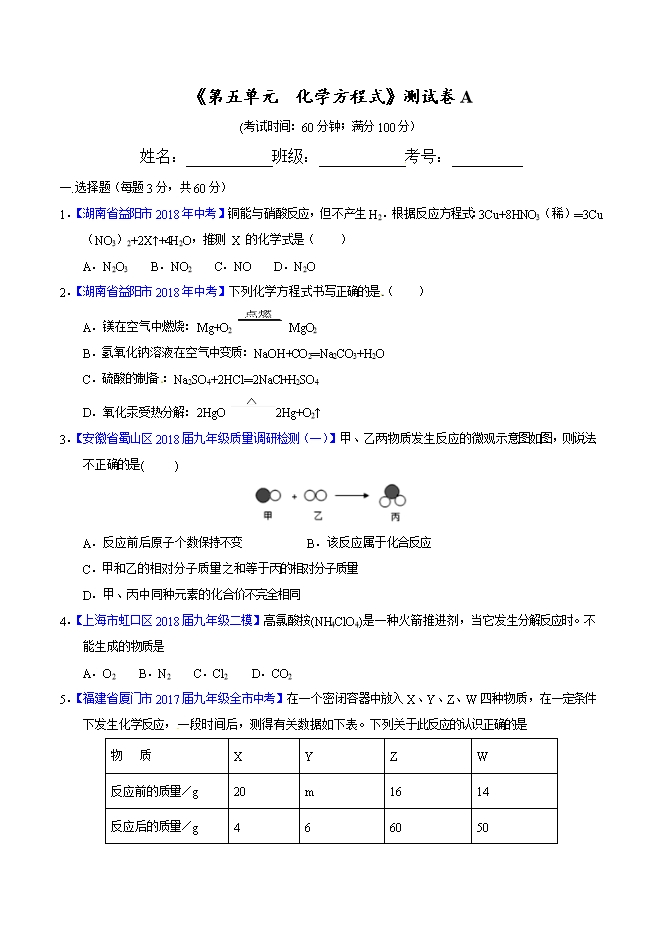 【内容简介】2019届人教版九年级化学《第五单元 化学方程式》同步单元双基双测“AB”卷(A卷)(word版无答案)