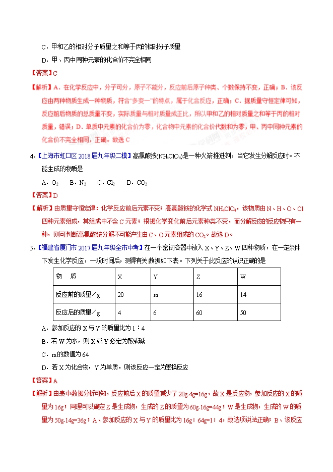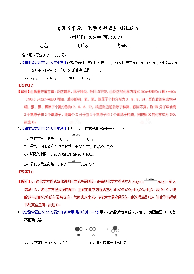 2019届人教版九年级化学《第五单元 化学方程式》同步单元双基双测“AB”卷(A卷)(word版含答案解析)