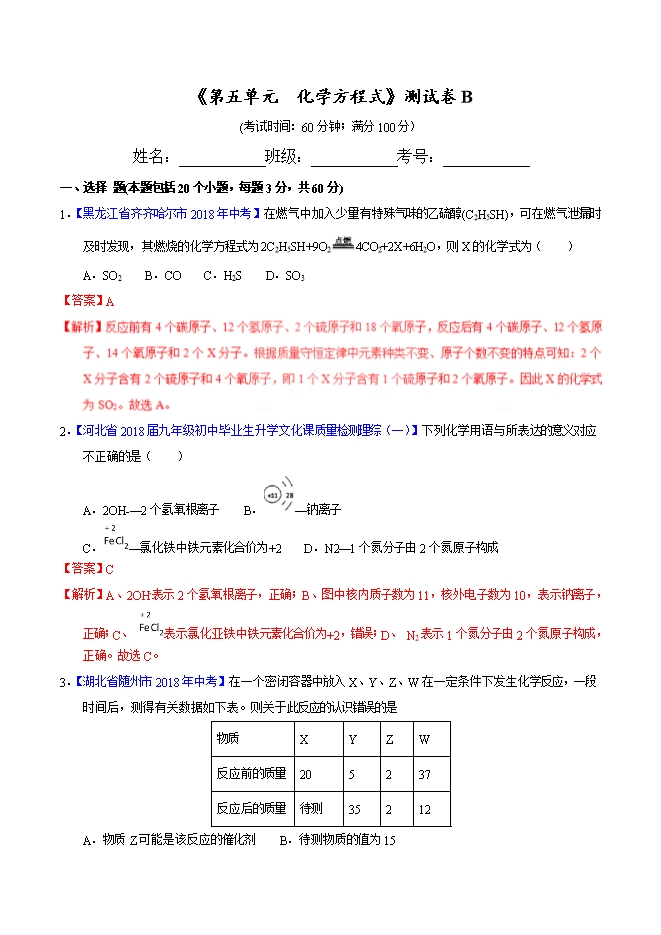 【内容简介】2019届人教版九年级化学《第五单元 化学方程式》同步单元双基双测“AB”卷(B卷)(word版含答案解析)