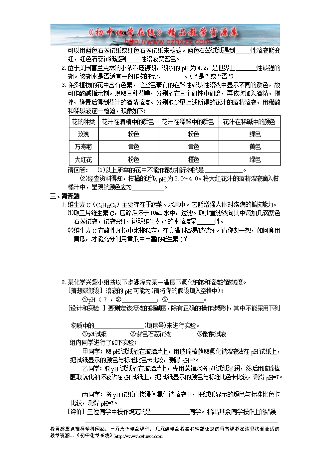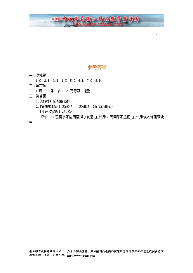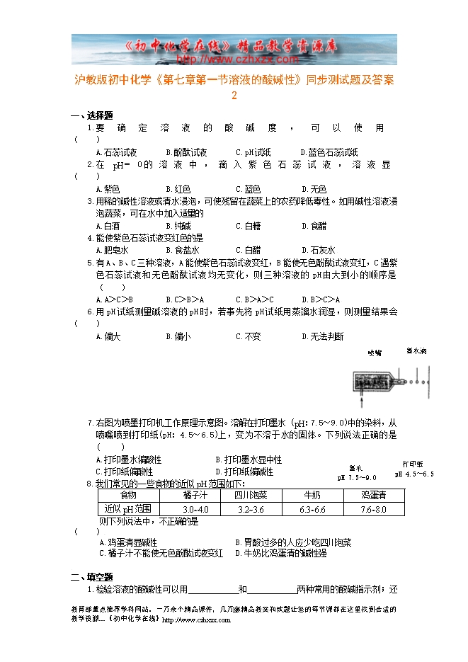 沪教版初中化学《第七章第一节 溶液的酸碱性》同步测试题及答案 2