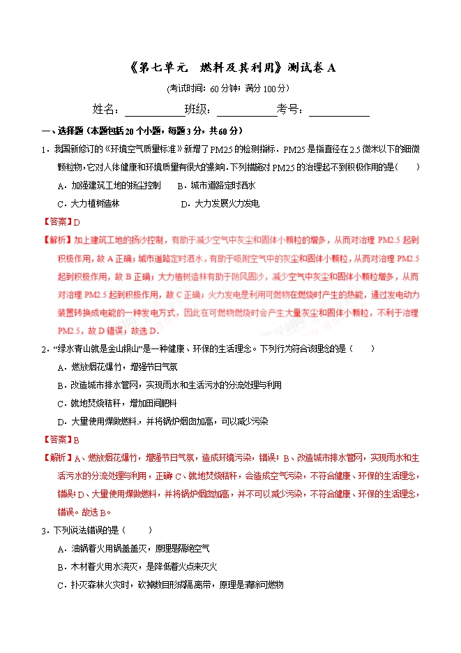 2019届人教版九年级化学《第七单元 燃料及其利用》同步单元双基双测“AB”卷(A卷)(word版含答案解析)