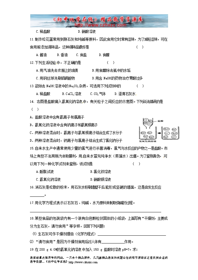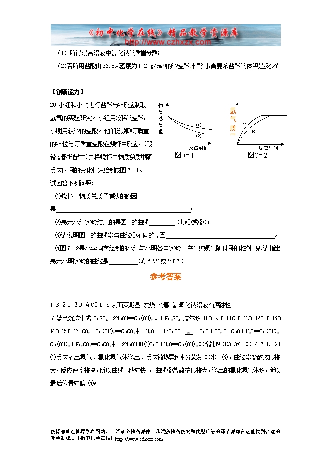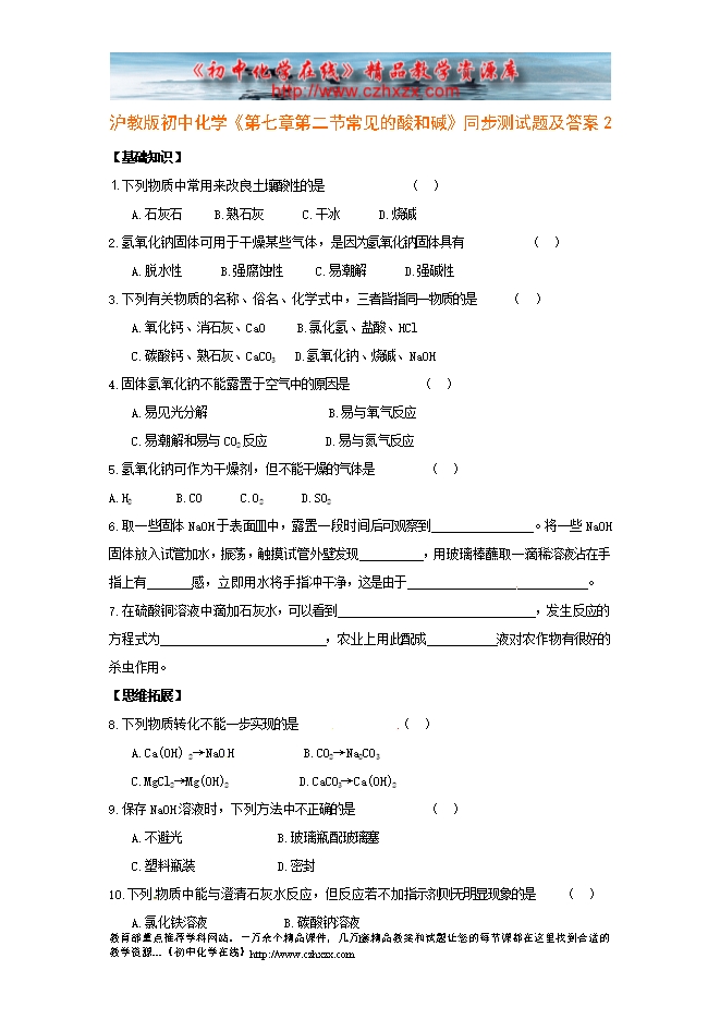 沪教版初中化学《第七章第二节 常见的酸和碱》同步测试题及答案2