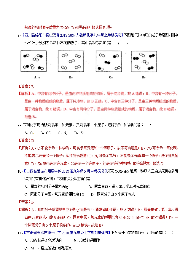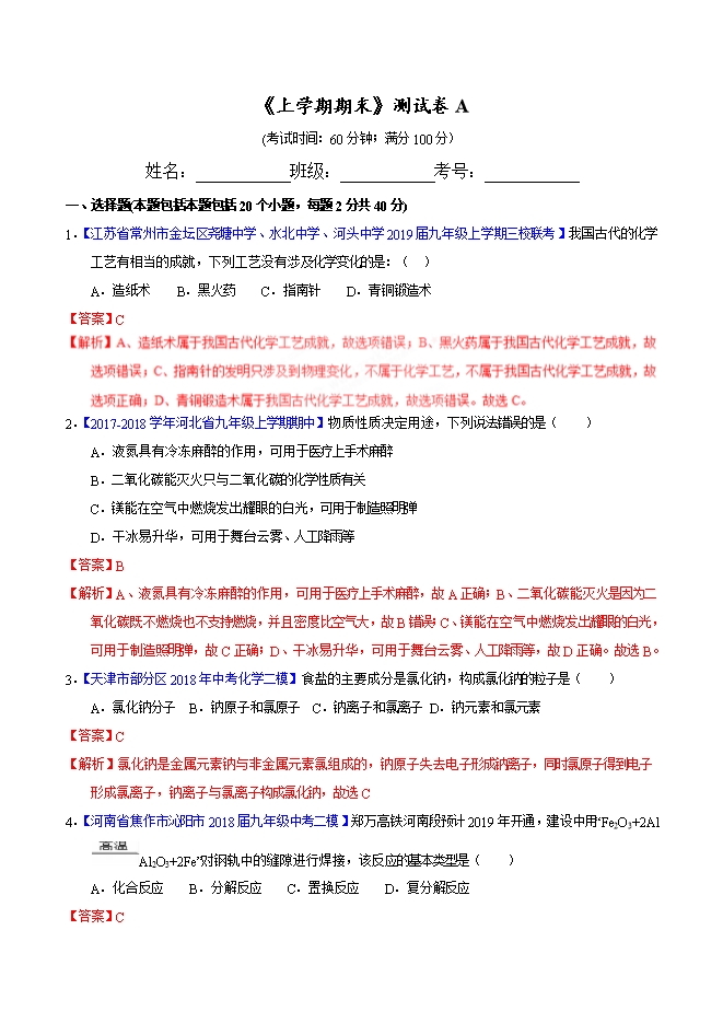 【内容简介】2019届人教版九年级化学《上册期末测试》同步单元双基双测“AB”卷(A卷)(word版含答案解析)