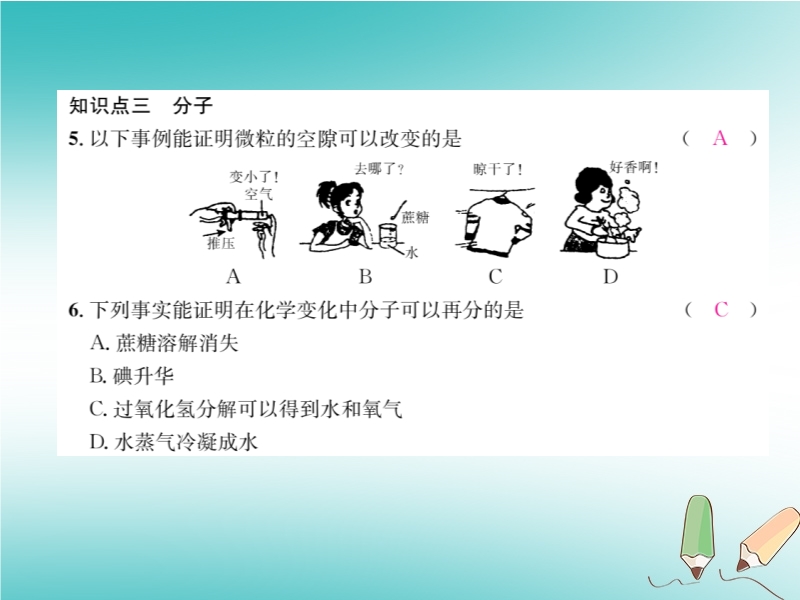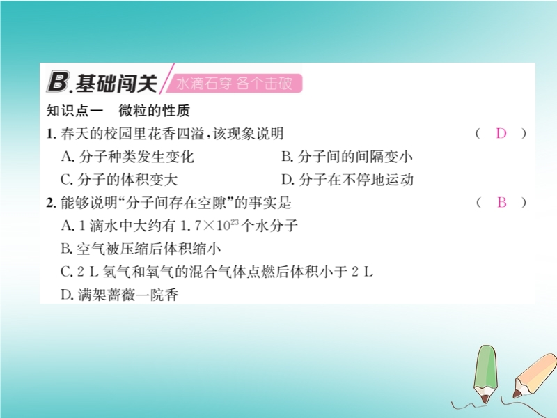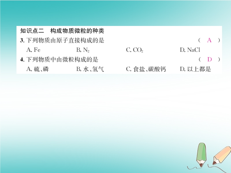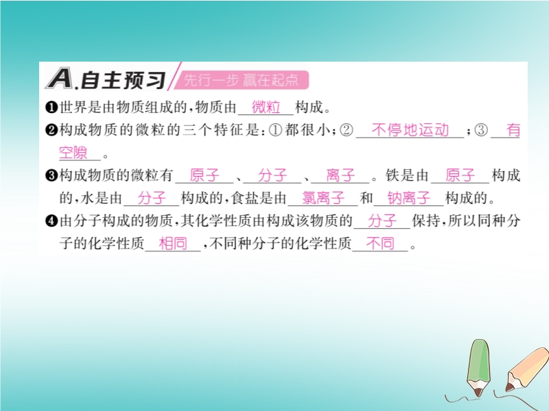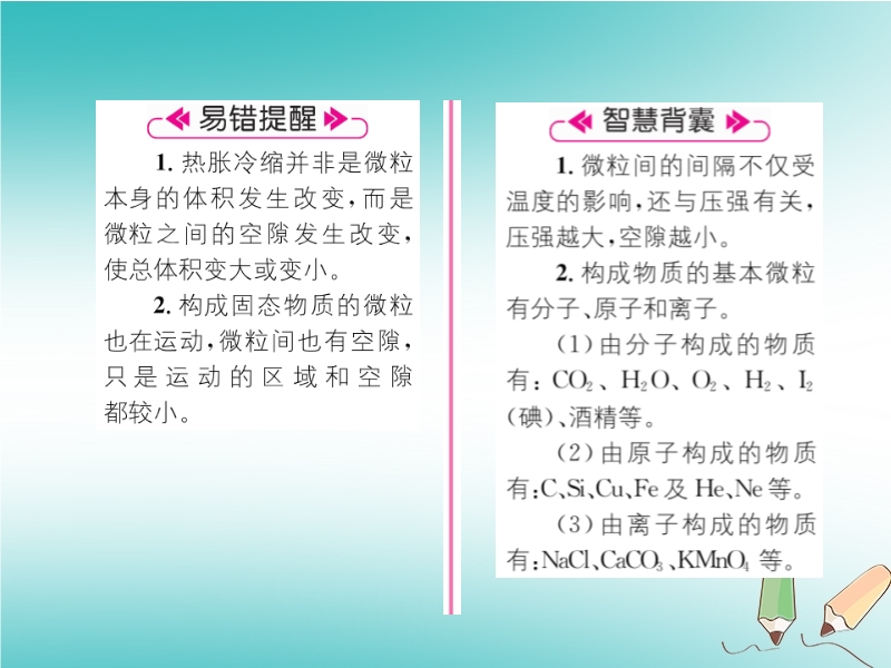 【内容简介】2018秋沪教版九年级化学上册《第3章第1节 构成物质的基本微粒(第1课时)》习题课件