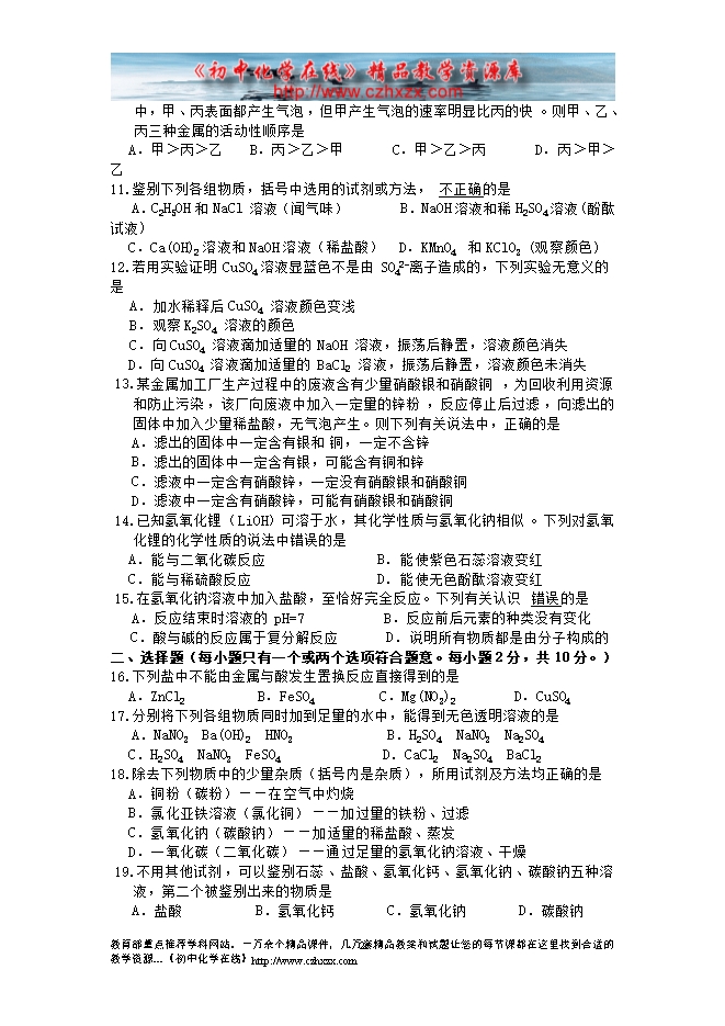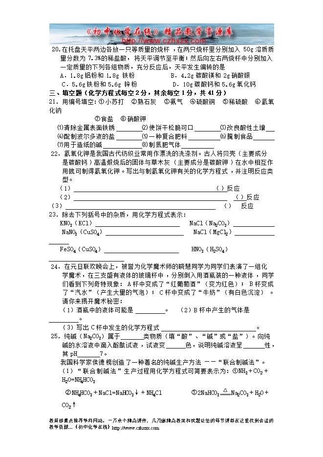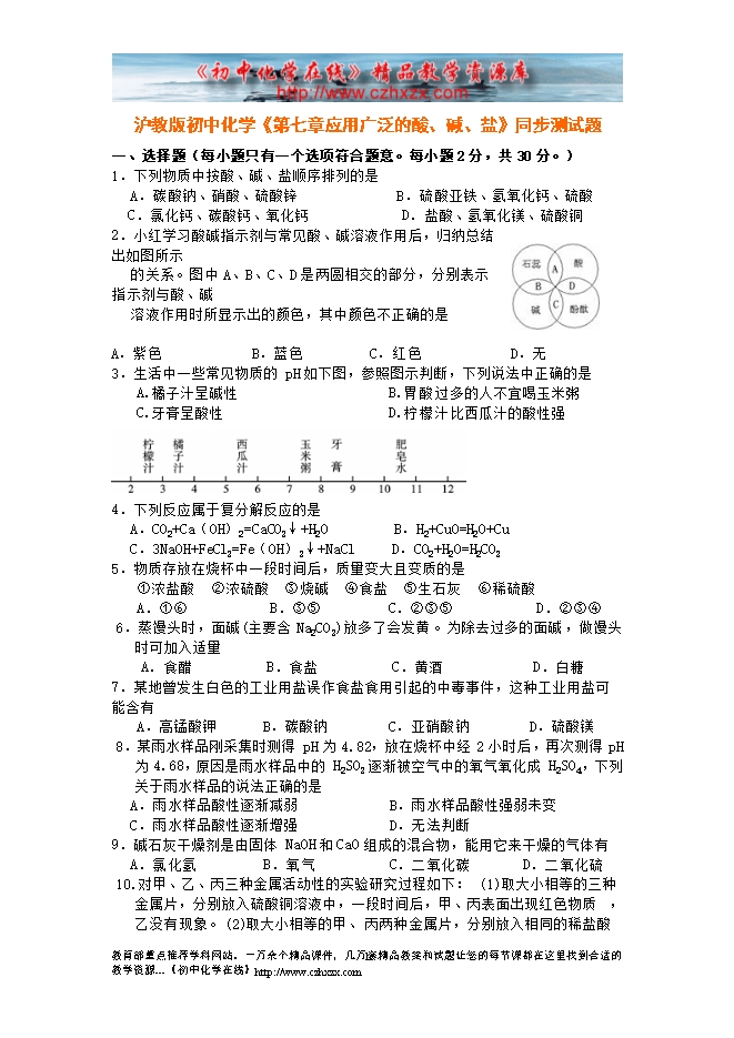 沪教版初中化学《第七章应用广泛的酸、碱、盐》同步测试题 3