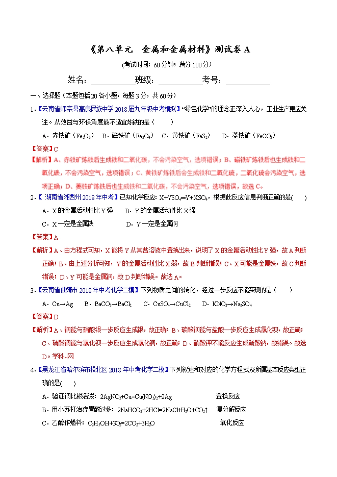 2019届人教版九年级化学《第八单元 金属和金属材料》同步单元双基双测“AB”卷(A卷)(word版含答案解析)