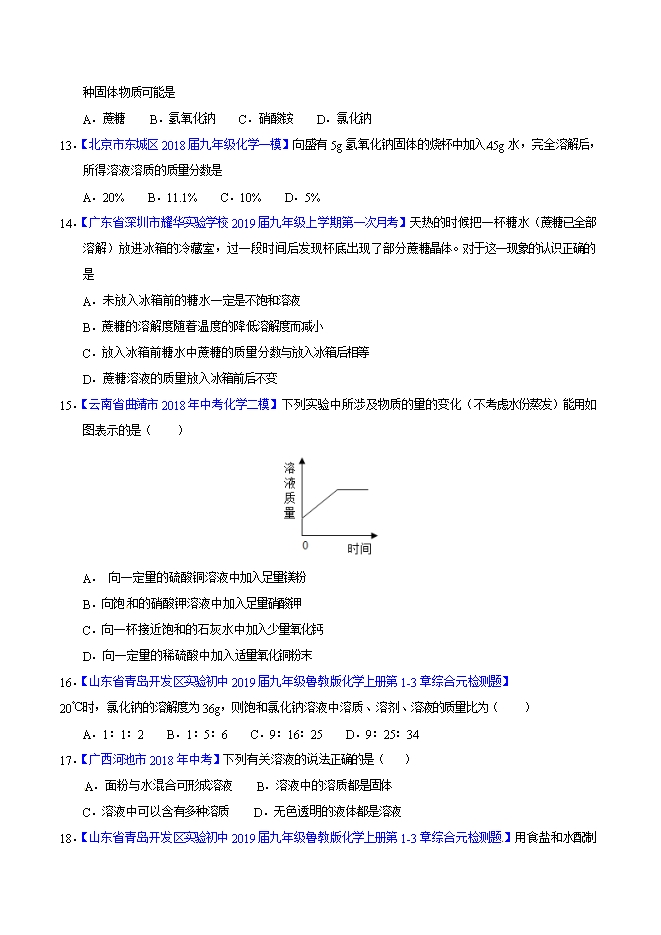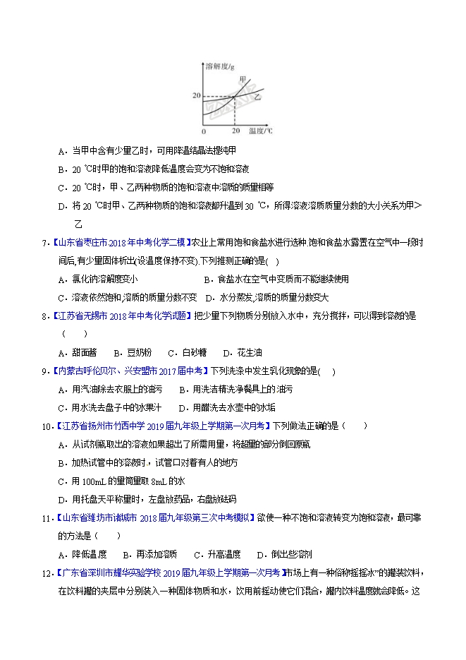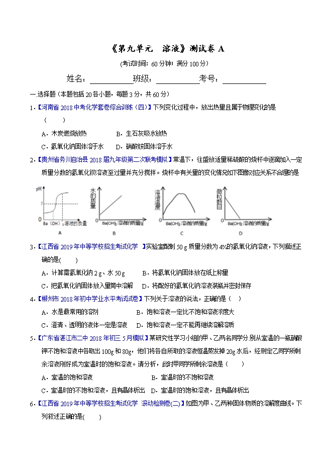 2019届人教版九年级化学《第九单元 溶液》同步单元双基双测“AB”卷(A卷)(word版无答案)