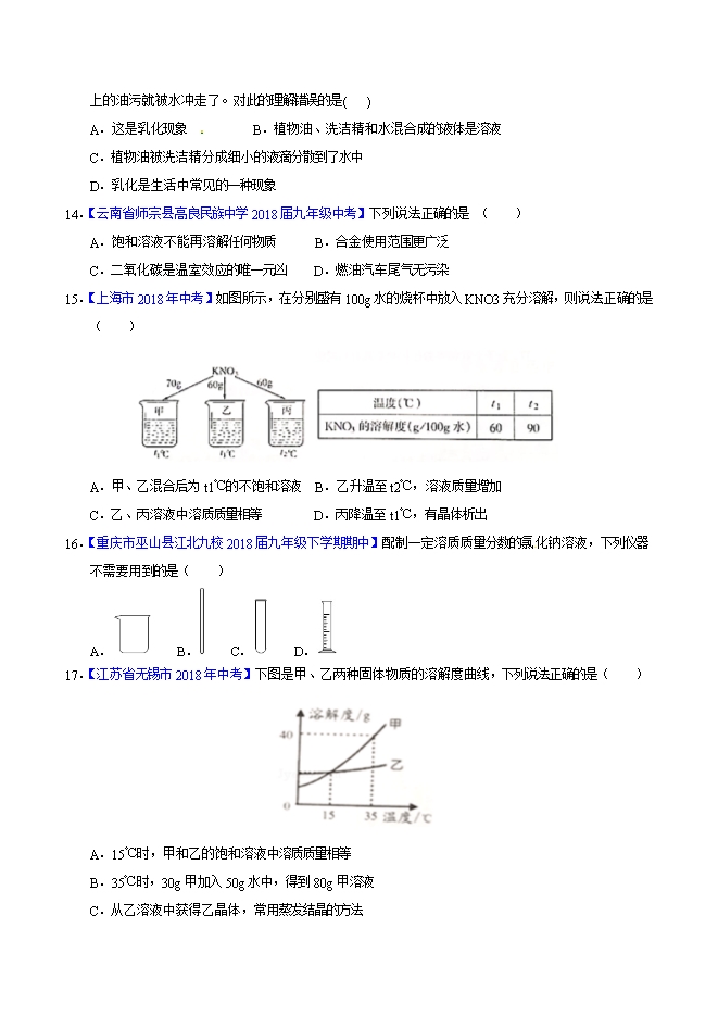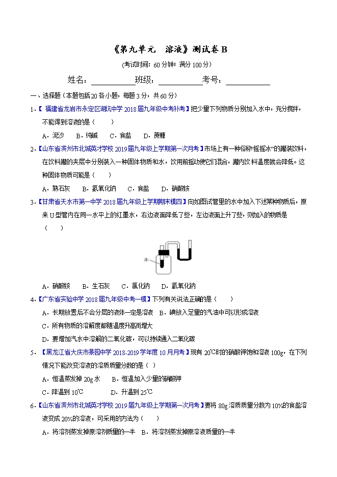 【内容简介】2019届人教版九年级化学《第九单元 溶液 》同步单元双基双测“AB”卷(B卷)(word版无答案)
