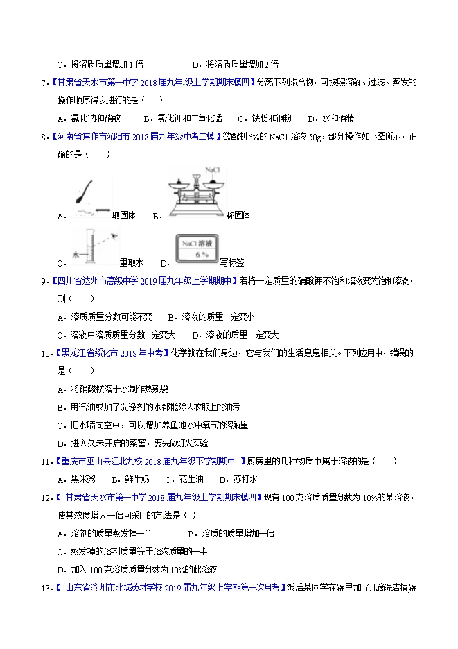 2019届人教版九年级化学《第九单元 溶液》同步单元双基双测“AB”卷(B卷)(word版无答案)