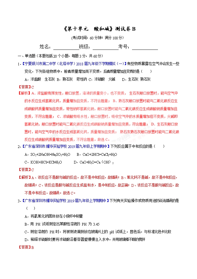 【内容简介】2019届人教版九年级化学《第十单元 酸和碱》同步单元双基双测“AB”卷(B卷)(word版含答案解析)