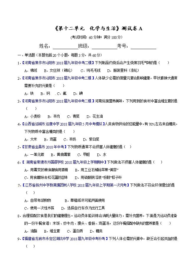 【内容简介】2019届人教版九年级化学《第十二单元 化学与生活》同步单元双基双测“AB”卷(A卷)(word版无答案)