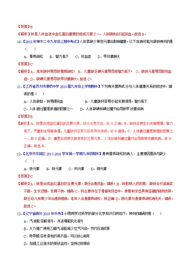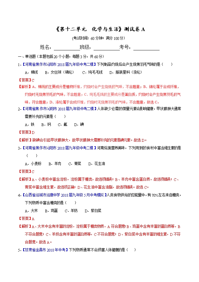 【内容简介】2019届人教版九年级化学《第十二单元 化学与生活》同步单元双基双测“AB”卷(A卷)(word版含答案解析)