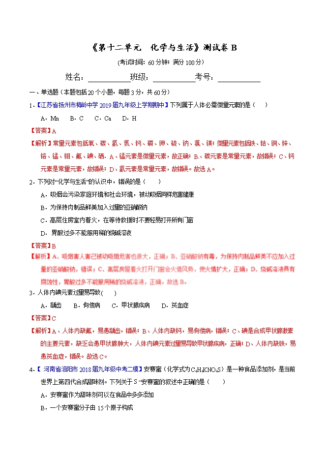 【内容简介】2019届人教版九年级化学《第十二单元 化学与生活》同步单元双基双测“AB”卷(B卷)(word版含答案解析)