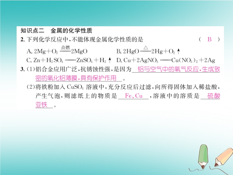 【内容简介】2018秋沪教版九年级化学上册《第5章第1节 金属的性质和利用(第1课时)》习题课件