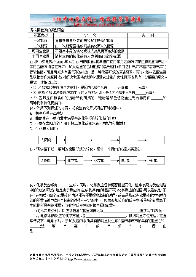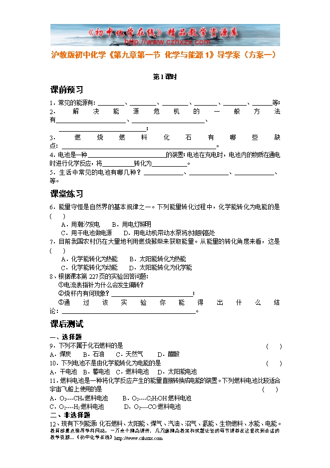 沪教版初中化学《第九章第一节 能源的综合利用》导学案(方案一)