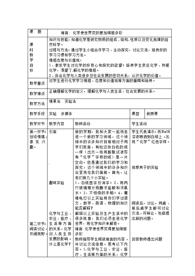 【内容简介】天津市宝坻区牛道口初级中学人教版九年级化学上册《绪言 化学使世界变的更加绚丽多彩》教案
