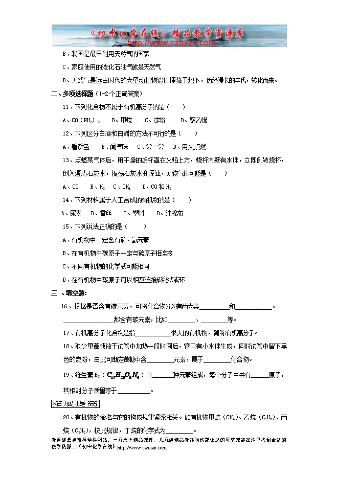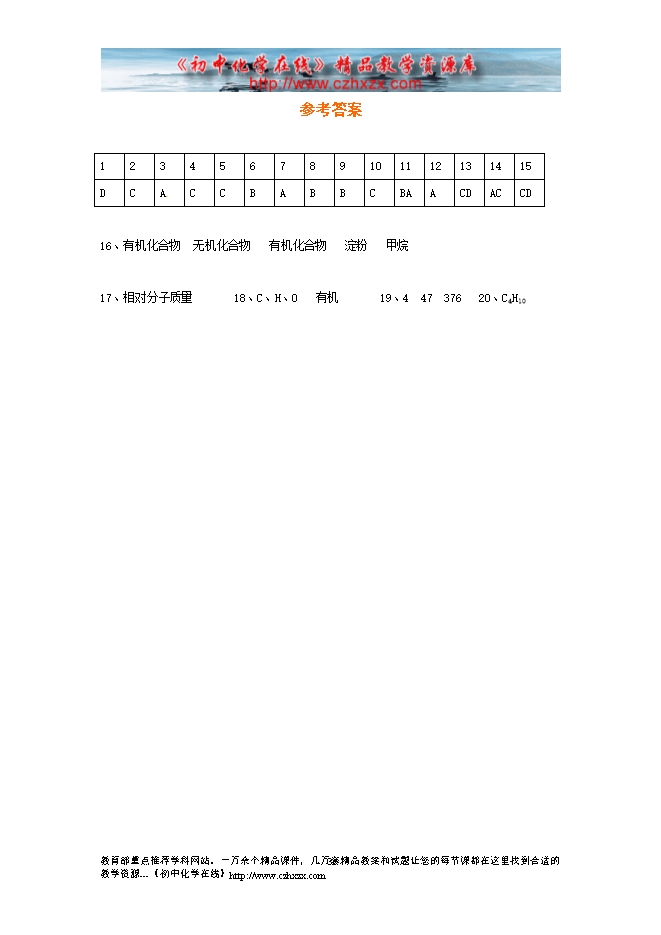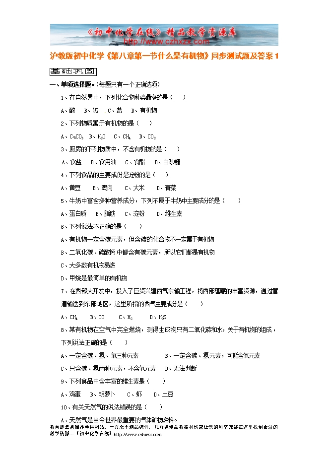 沪教版初中化学《第八章第一节 什么是有机化合物》同步测试题及答案1