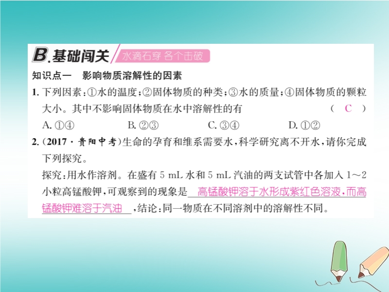 【内容简介】2018秋沪教版九年级化学下册《第6章第3节 物质的溶解性(第1课时)》习题课件