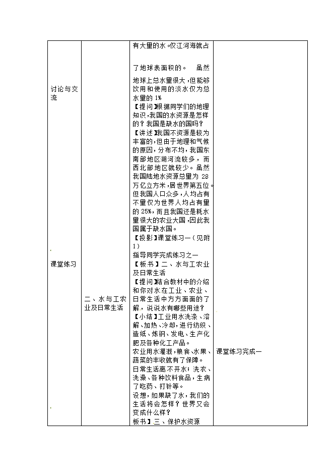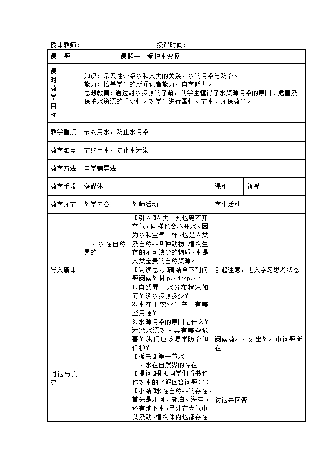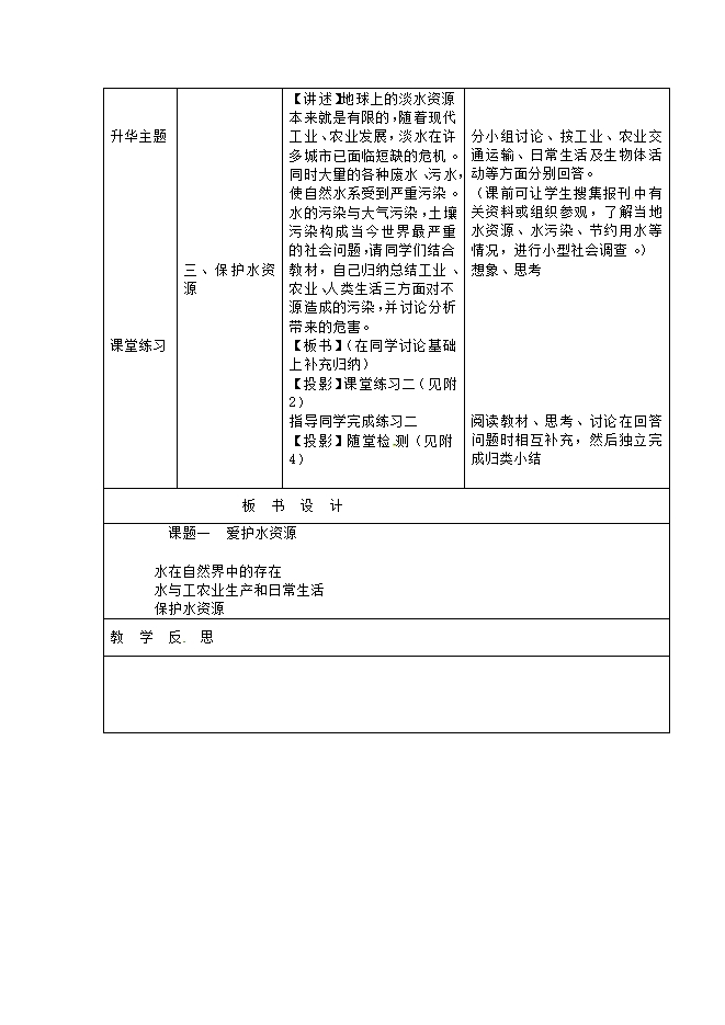 【内容简介】天津市宝坻区牛道口初级中学人教版九年级化学上册《4.1爱护水资源》教案