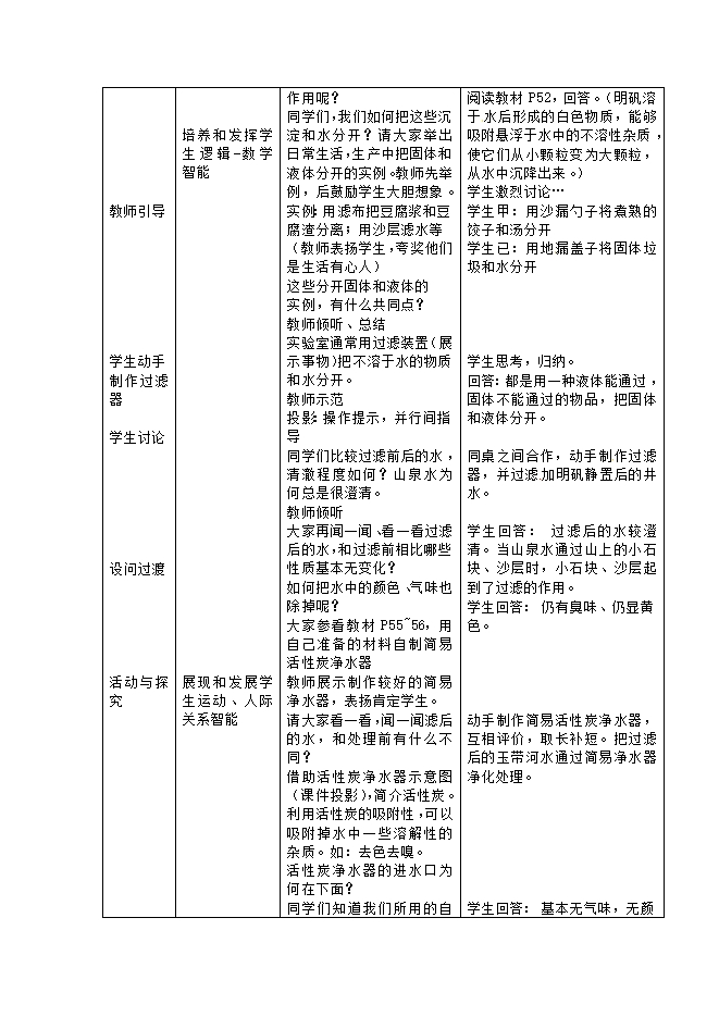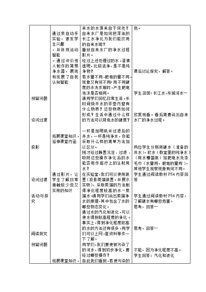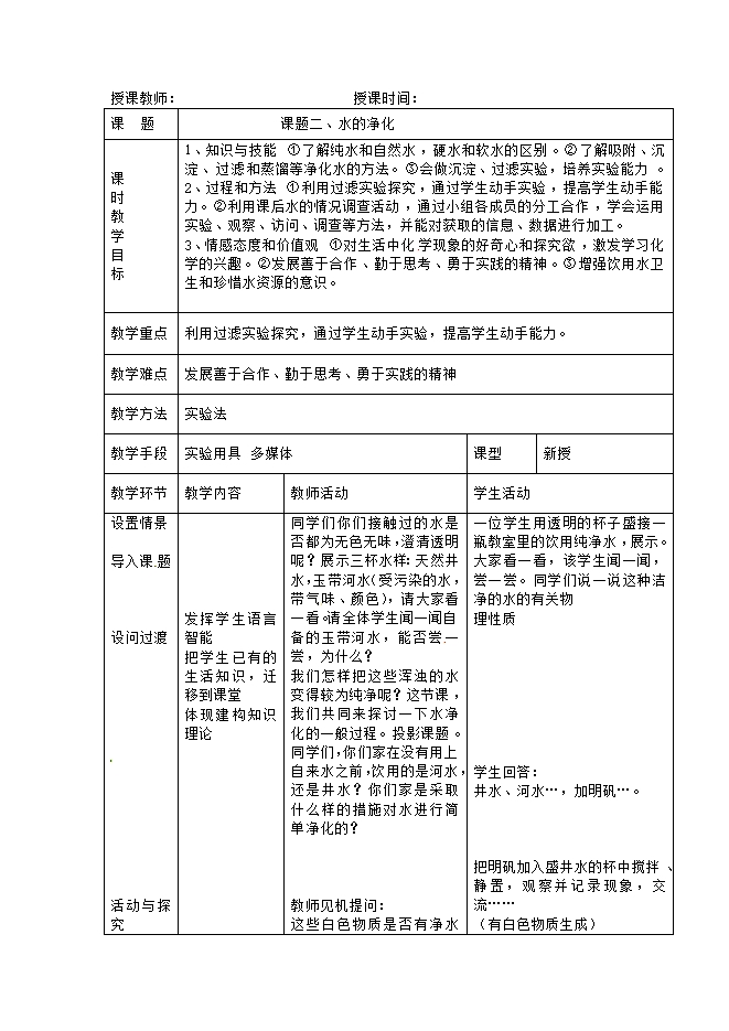【内容简介】天津市宝坻区牛道口初级中学人教版九年级化学上册《4.2水的净化》教案